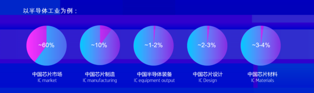 但是我们的芯片的制造能力呢,大家可能都知道中兴国际、长江存储、兆易创新等中国数一数二的芯片及芯片制品如存储器等巨头公司,都加起来在全球的市场份额还不到10%。再看一个数据,中国半导体装备实际上只占百分二点几,也许大家看到了中微公司、北方华创,包括海松资本投的一家半导体装备公司,屹唐半导体,以及一些装备相关的企业,这些都加起来在市场总额在全球2%不到。还有芯片设计公司,包括海思在内的各类细分领域的芯片设计公司,占不到全球3%总额。芯片材料领域也是如此,可能稍微好一点。从这张图大家可以看到,虽然中国有这么巨大的一个市场,但实际上无论从制造能力,到设计能力,到装备制造包括核心零部件、材料等等,实际上占全球份额是非常低的。半导体领域只是硬核科技其中的一个方面。